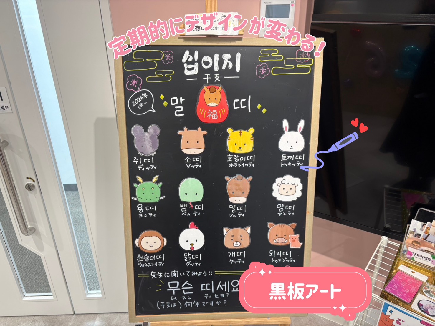 入口横のモニターでは、韓国の最新情報を配信中!なんば校オリジナルのネオンサインにも注目☆