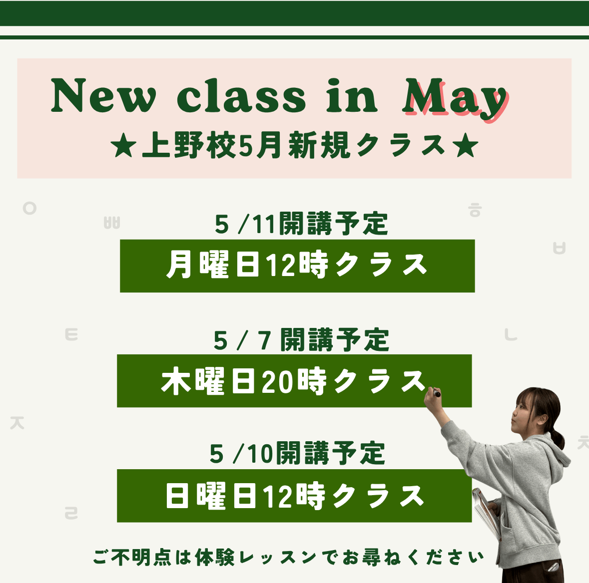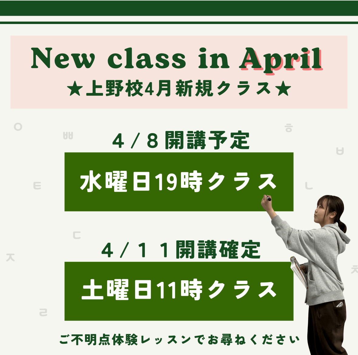 初心者の方向けの無料体験レッスンは簡単な発音から読み方までを体験レッスン!ちょっとした単語も読めるようになるかも。(15分程度です)