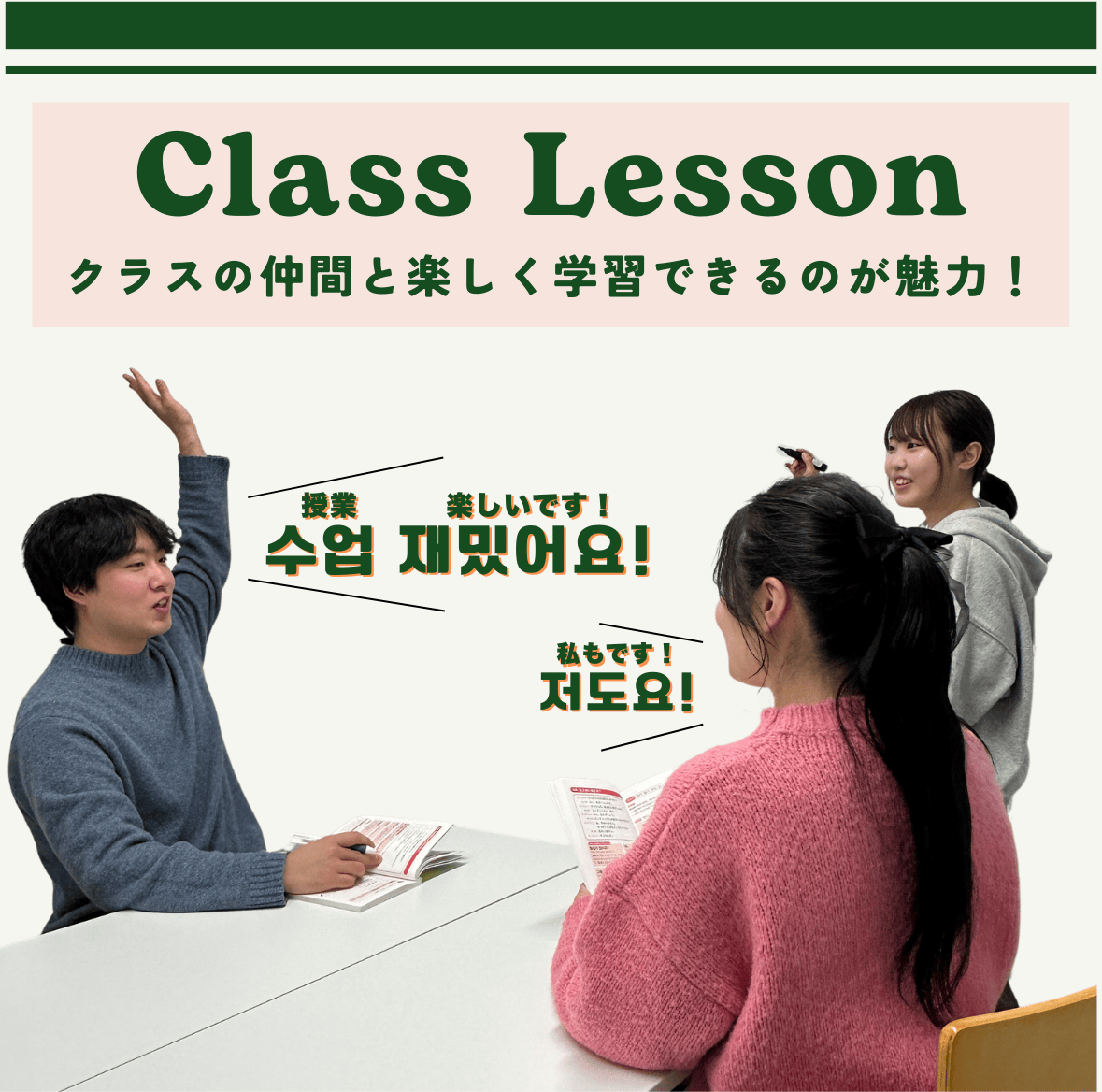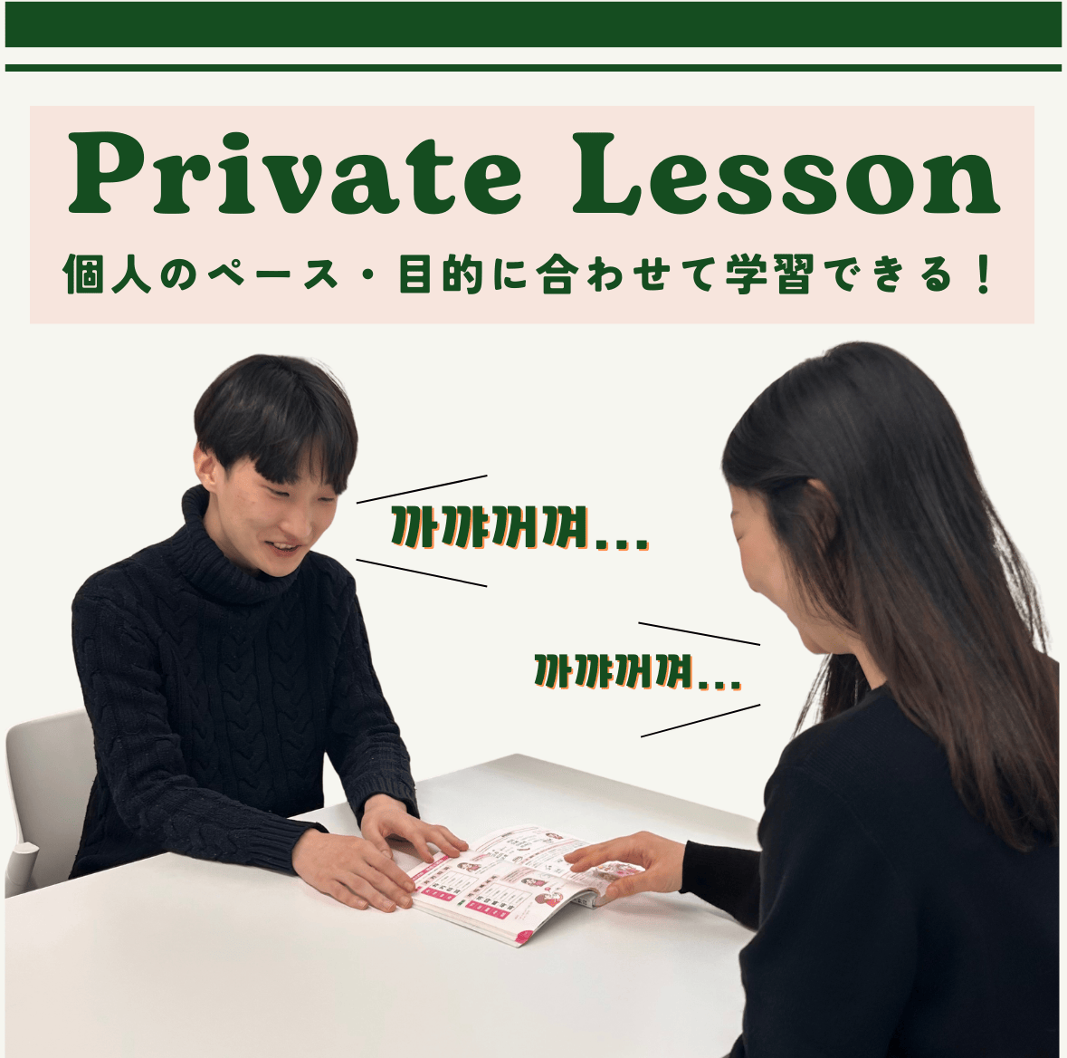 2:1のレッスンで、気兼ねなく仲の良いお友達と韓国語を習うことが出来ます。