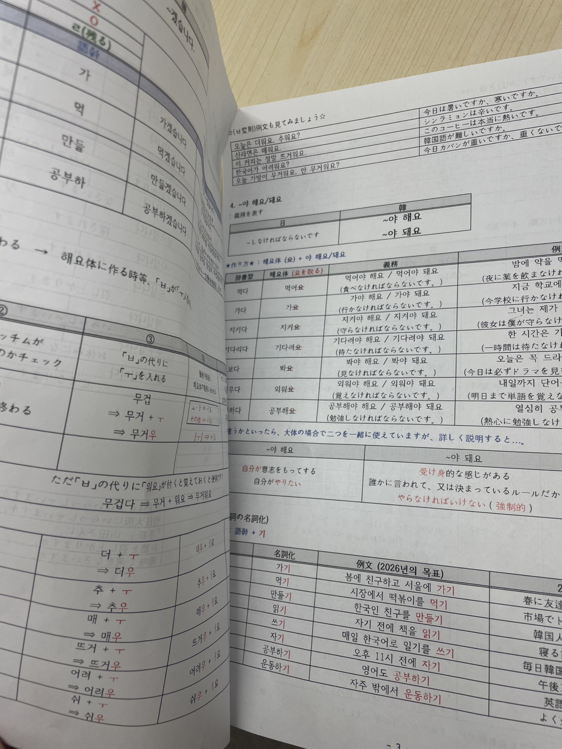 LESSON11の尊敬表現や未来・意思表現、ㅂ変則の해요体からLESSON12の【야 하다/되다・〜しなければならない】、【기 싫다・〜したくないです】さらに【기・〜すること 名詞化】【ㄹ 수 있다/없다・可能/不可能】まで50分の講座でかなり濃い内容を復習しました!