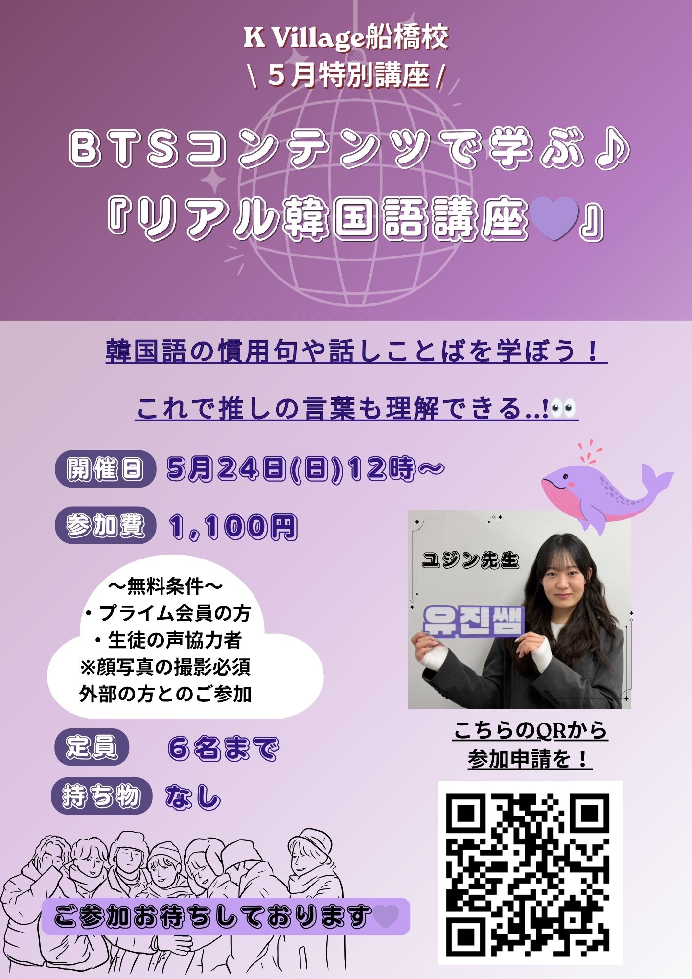 さて、5月の特別講座は船橋校の新メンバーユジン先生による【BTSコンテンツで学ぶ♪リアル韓国語講座💜】でございます✨