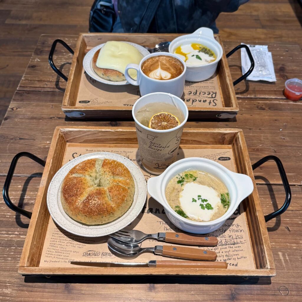 手前がゆず茶とバジルベーグルとマッシュルームスープ、奥がカフェラテとチーズベーグルとパンプキンスープです🍽