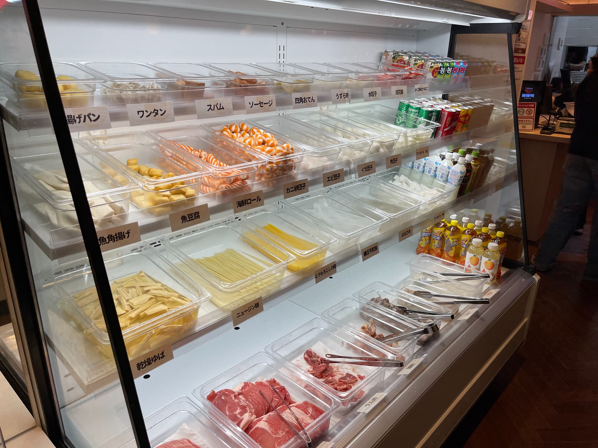 入口付近には野菜やトッポギ、奥にはお肉や練り物系が陳列されていました。