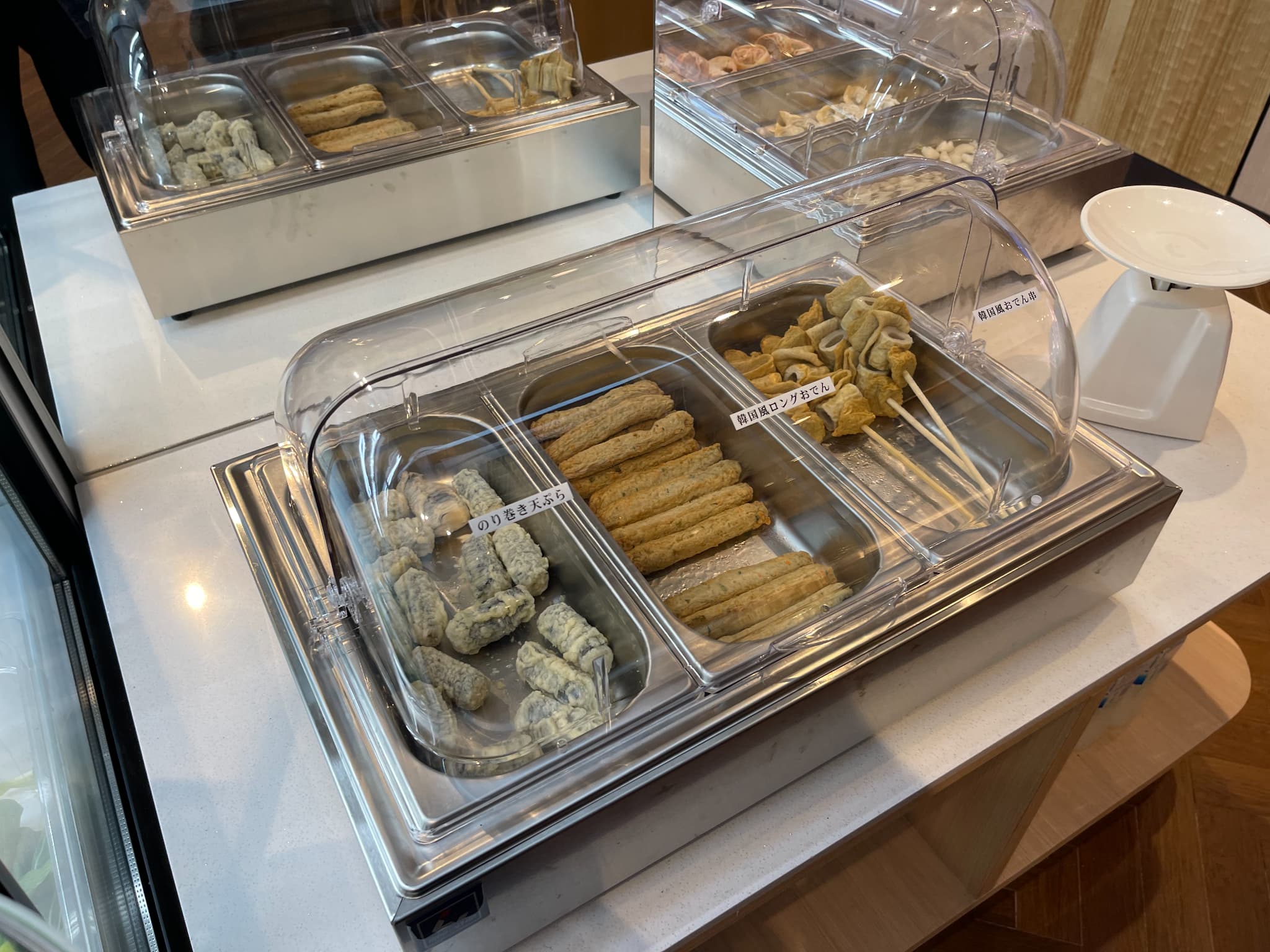 海苔巻き天ぷら(キンマリ)や串にささった韓国風おでんもあり、韓国式マーラータンならではだなと感じました。