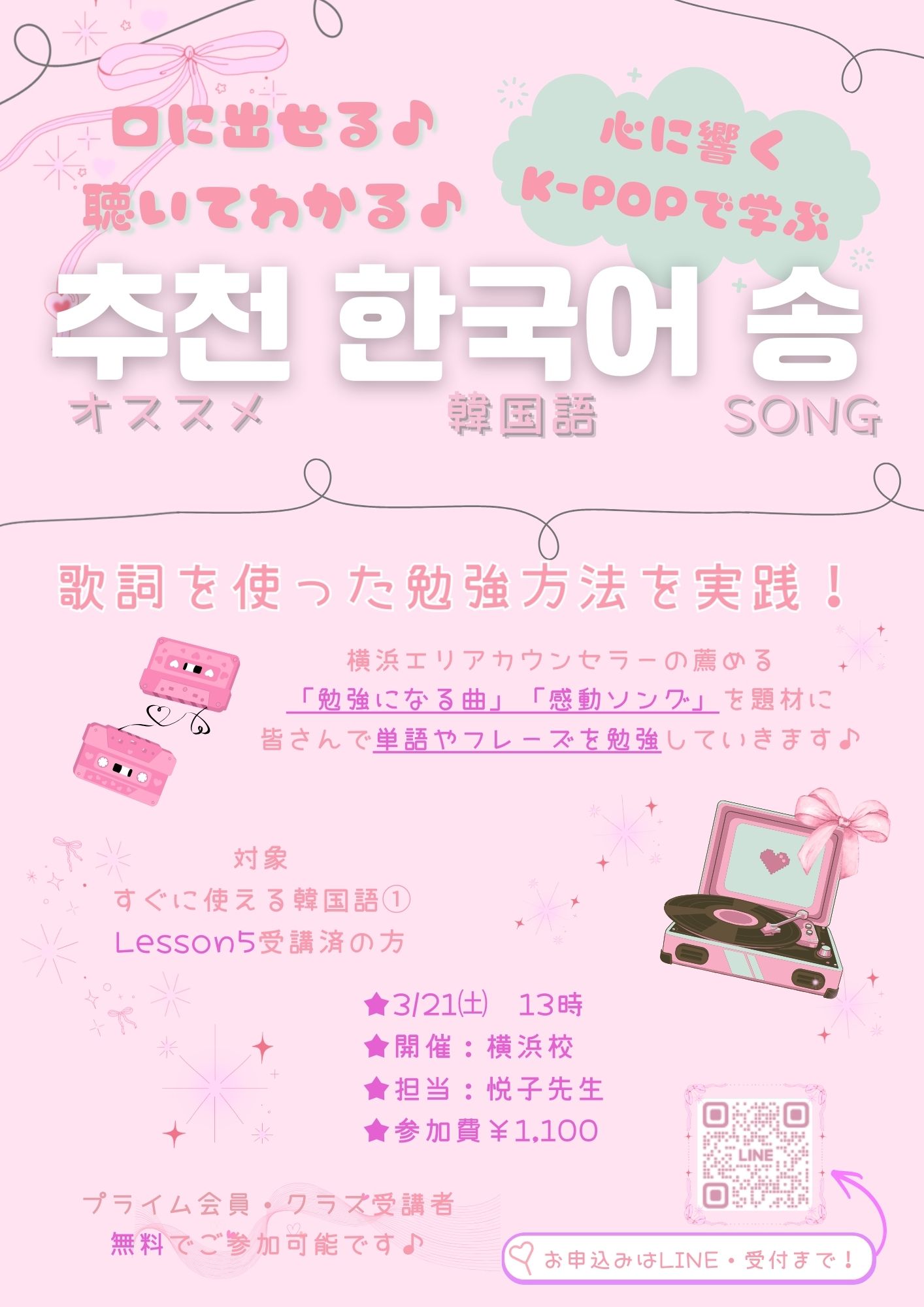 3月講座①口に出せる!聴いてわかる!心に響くK-POPで学ぶ추천 한국어 송✨