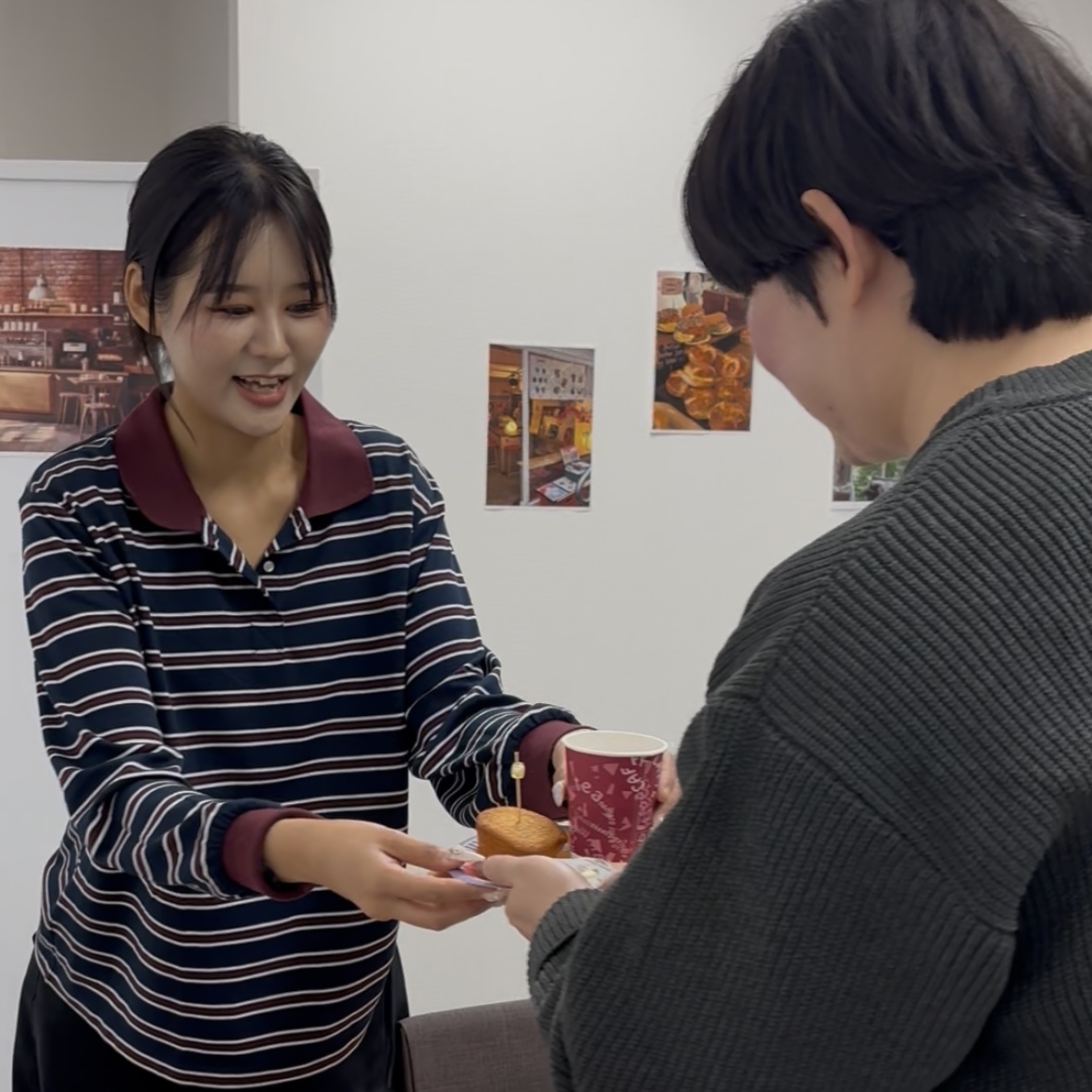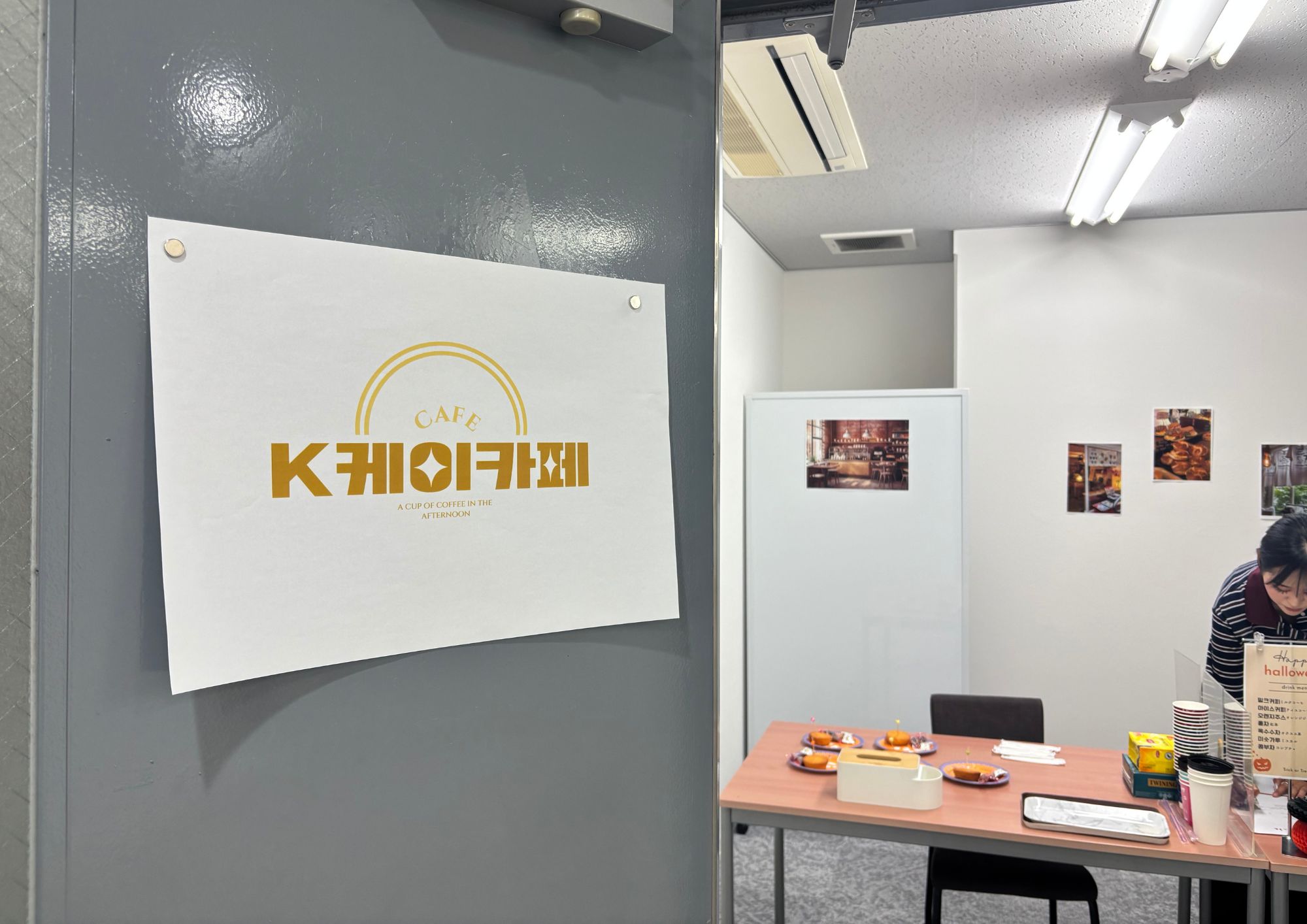 福岡天神校に当日限定でオープンした「케이카페(Kカフェ)」で、1人ずつ韓国語で注文に挑戦しました。