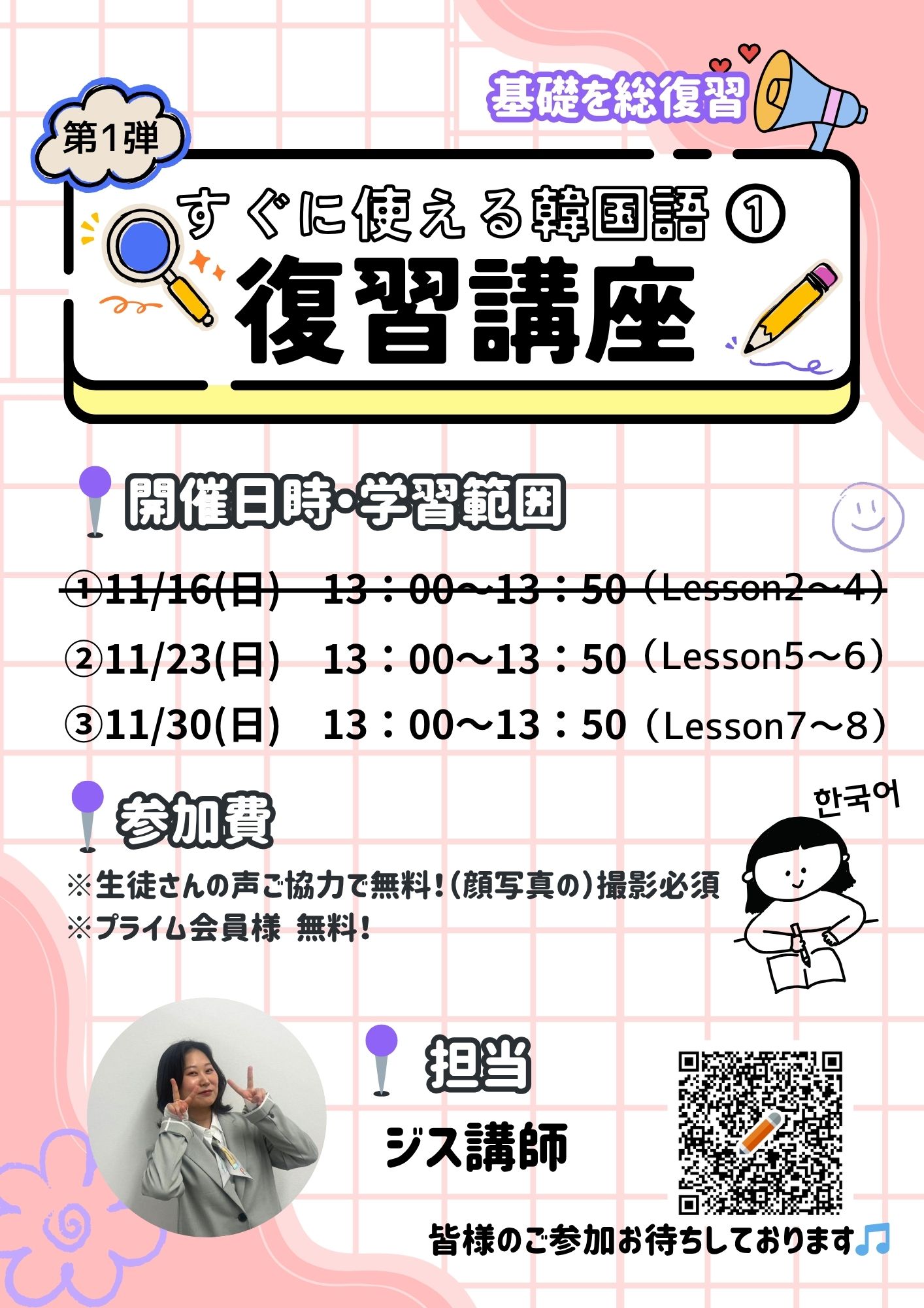 11月【すぐに使える韓国語①復習講座】お申し込みはコチラ