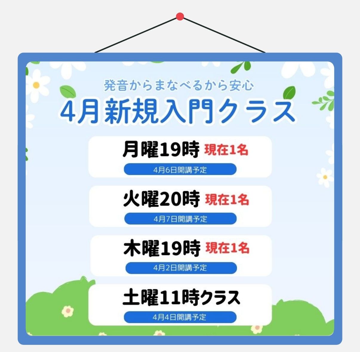 初心者の方向けの無料体験レッスンは簡単な発音から読み方までを体験レッスン!ちょっとした単語も読めるようになるかも。(15分程度です)