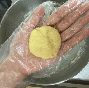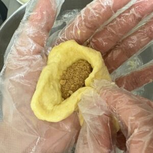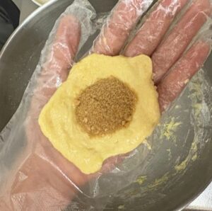 生地を手のひらに広げて、真ん中に付属の砂糖をのせます!