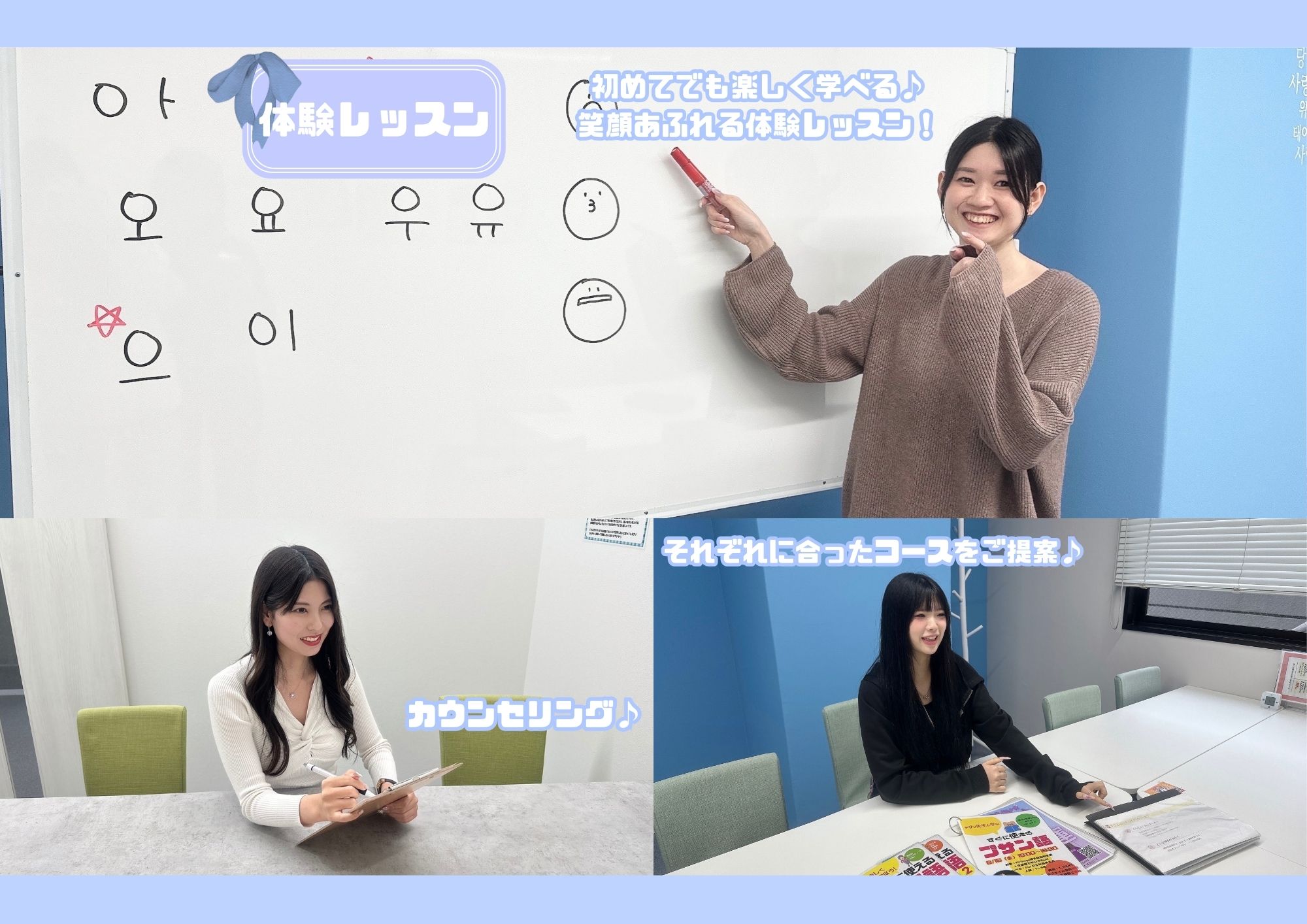 韓国語未経験からスタートされる生徒様が80%以上となります^^ 講師は若くフレンドリーな韓国人講師となりますので質問もしやすいです♪