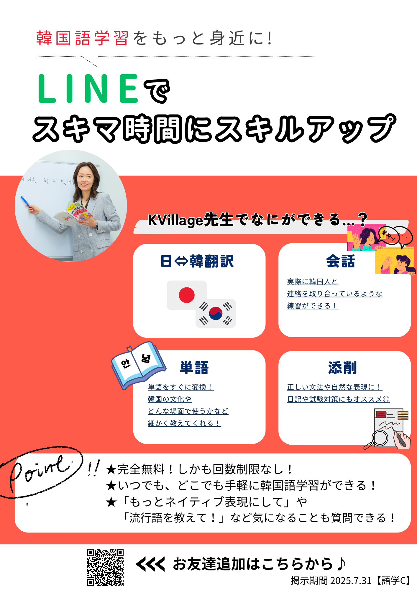 KVillage先生をLINEに追加いただけたら韓国語の添削もしてくれるので是非ご活用ください!