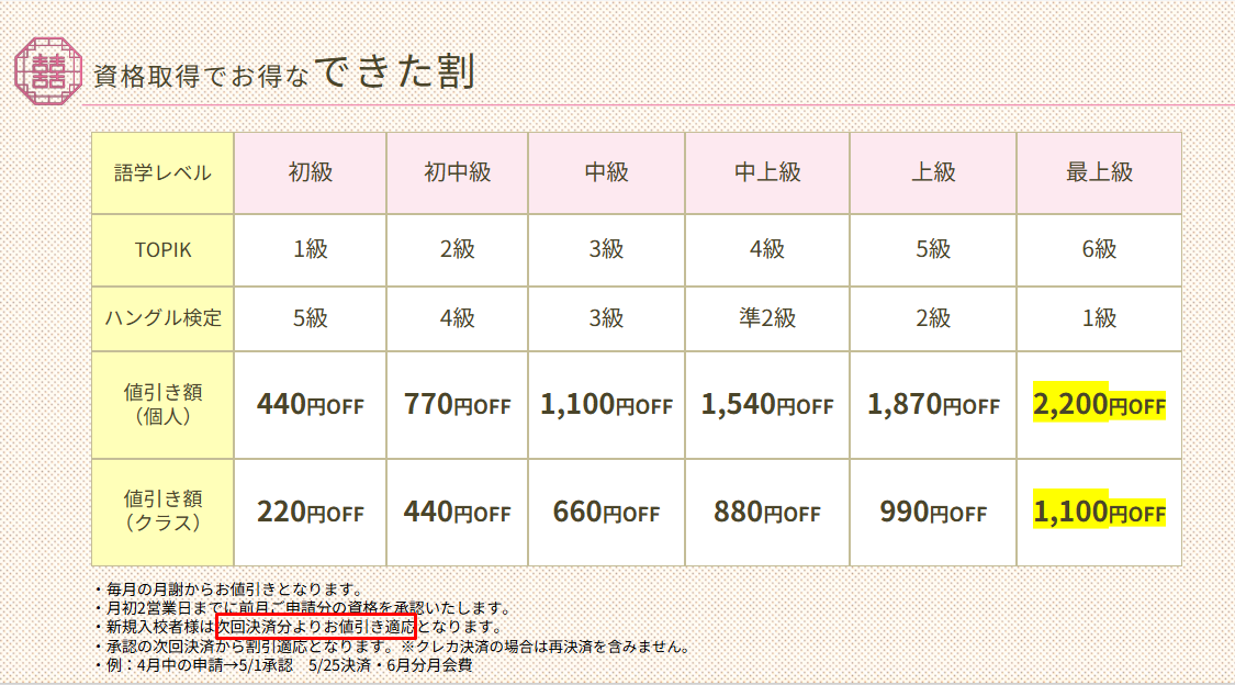 KVillageではハングル検定・TOPIKを合格された方には「できた割」の適用で毎月のお月謝が割引になりますので、まだ受講されたことが無い方は是非ご受講されてみてください✨
