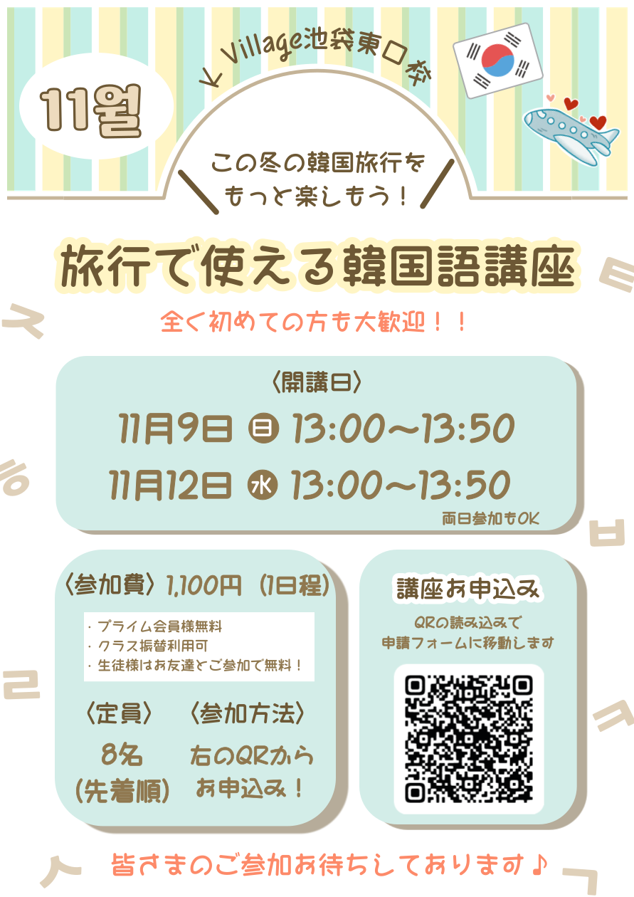 K Village 池袋東口校では、11月の特別イベント「旅行で使える韓国語」を開催します!