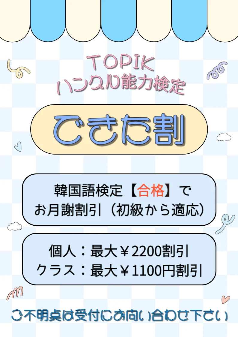 ハングル検定やTOPIKの取得、留学を目指している方、自分の生活リズムに合わせて学習したい場合は、プライベートレッスンをお勧めいたします♪ また、お友達を作りたい、みんなとワイワイ楽しくレッスンをしたい!という方にはクラスレッスンがおすすめです! プライベートレッスンもクラスレッスンも安心して学習できるよう韓国好きのスタッフが皆様をサポートいたします♪