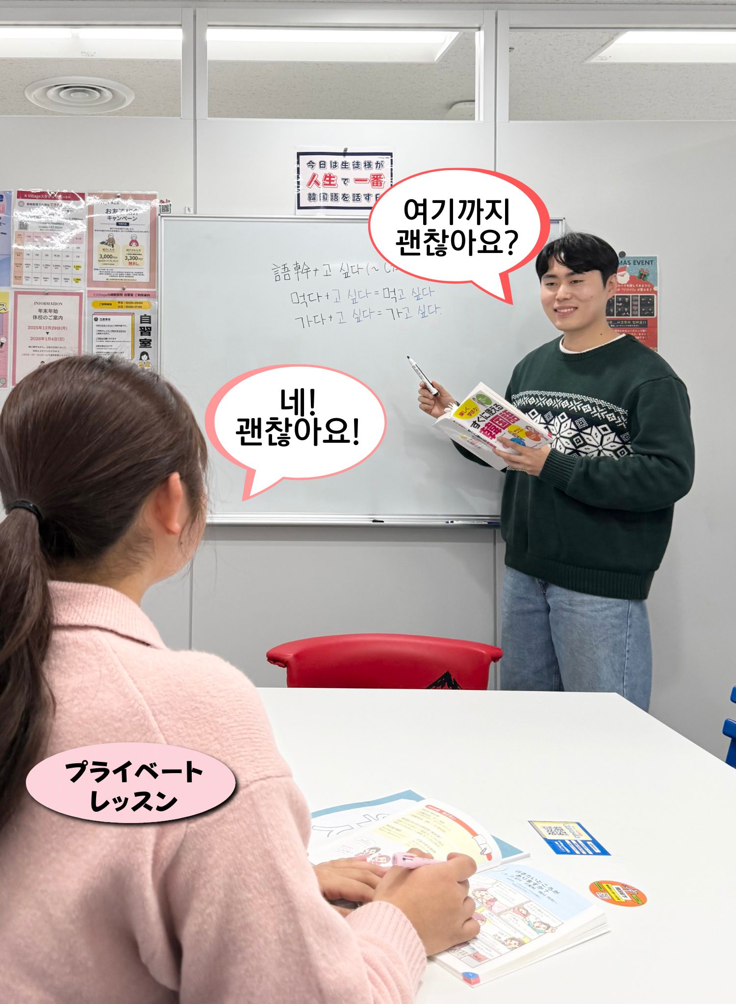 会話ベースの授業が受けたい、ドラマのセリフを覚えたい、KPOPの歌詞が知りたい、TOPIK(韓国語能力試験)の対策がしたい、韓国語でフリートークをしたいなど、授業内容は何でもOKなのもプライベートレッスンならでは!