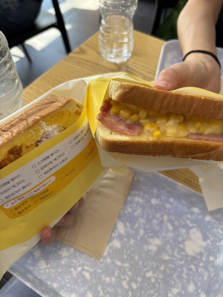 私は프렌치 햄치즈(フレンチハムチーズ)を頼み、友人は콘베이컨 에그마요(コーンベーコンエッグマヨ)を頼みました。