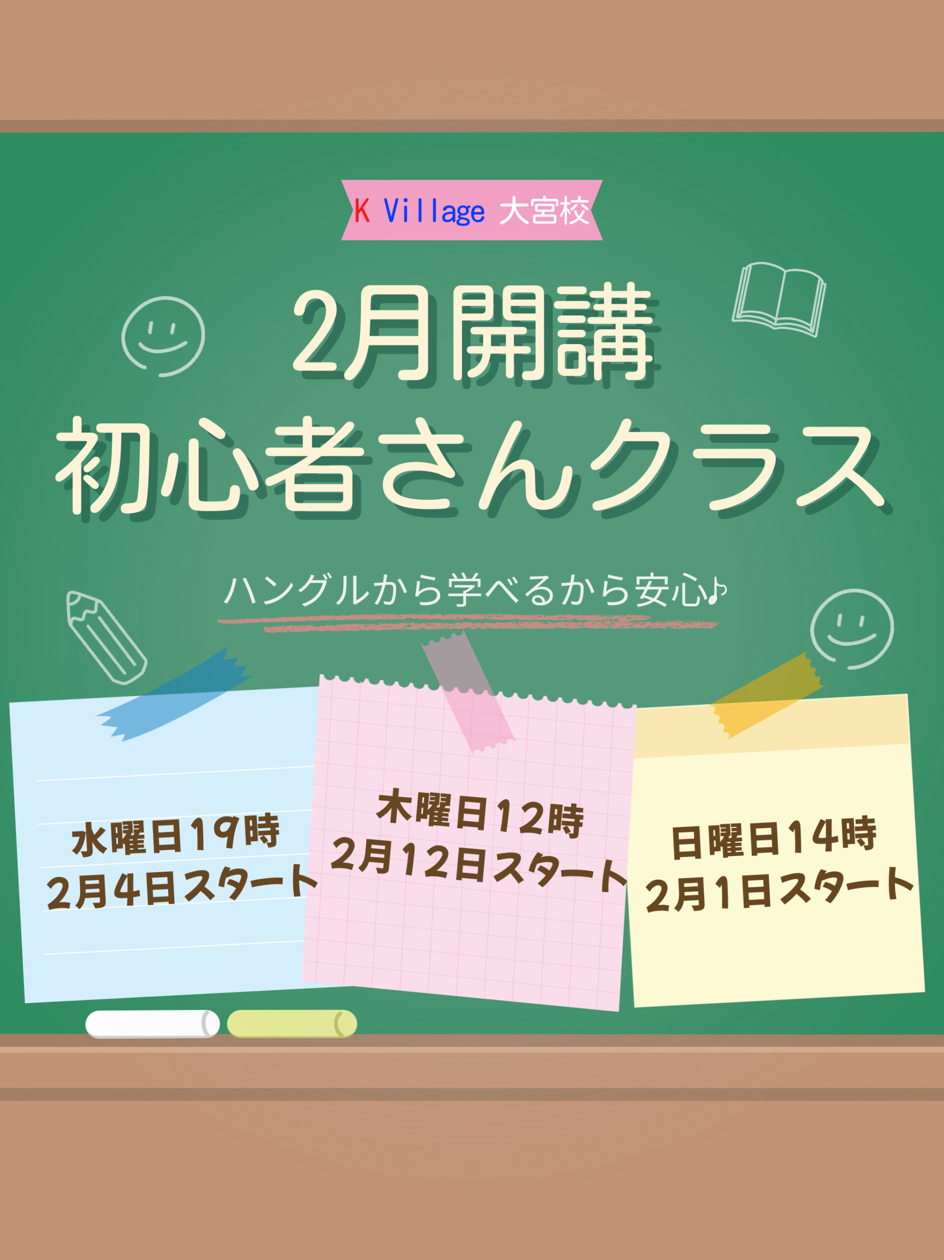 もちろんです!!韓国語教室 K Village 大宮校にいらっしゃる生徒様は、ハングルが読めない状態からスタートされた方が約70%です。韓国語ネイティブ講師が日本語で丁寧に進めますので、安心してレッスンをお楽しみください♪K-POPや韓国ドラマ好きの生徒様がほとんどで、楽しく通えますよ^^大宮をはじめ、浦和・上尾・川口・戸田・蕨・志木・越谷・新座・川越・久喜・鴻巣など、埼玉県内の幅広いエリアから通っていただいています。また群馬県高崎・前橋や、栃木県宇都宮から通う生徒様もいらっしゃいます♪