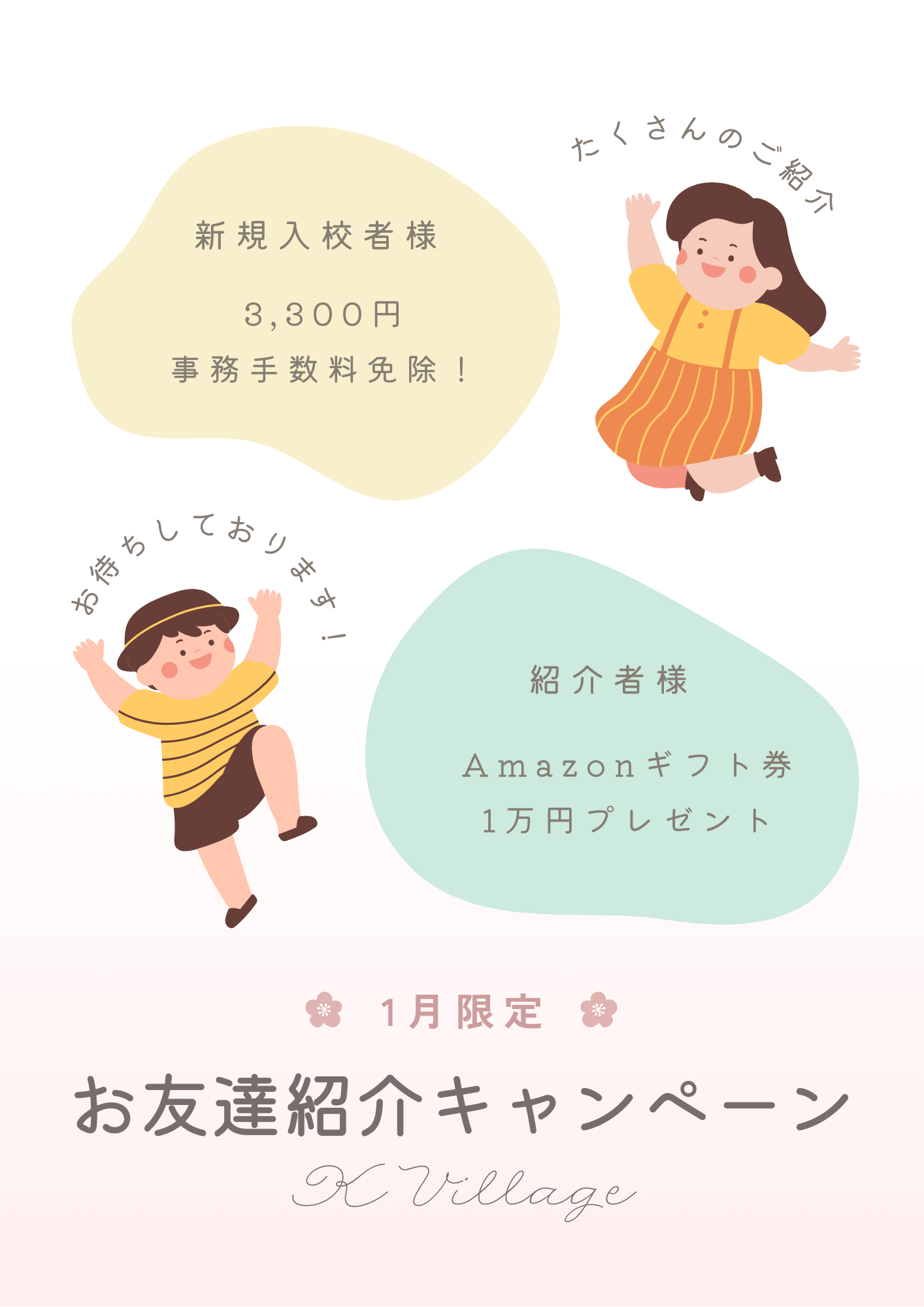 お友達紹介で新規入校の方は事務手数料免除!ご紹介者様にはギフト券プレゼント♪