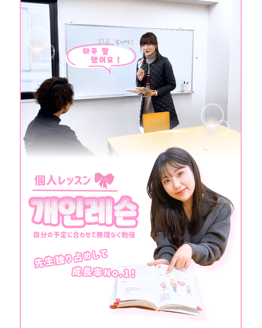 会話ベースの授業が受けたい、ドラマのセリフを覚えたい、KPOPの歌詞が知りたい、TOPIK(韓国語能力試験)の対策がしたい、韓国語でフリートークをしたいなど、授業内容は何でもOKなのもプライベートレッスンならでは!