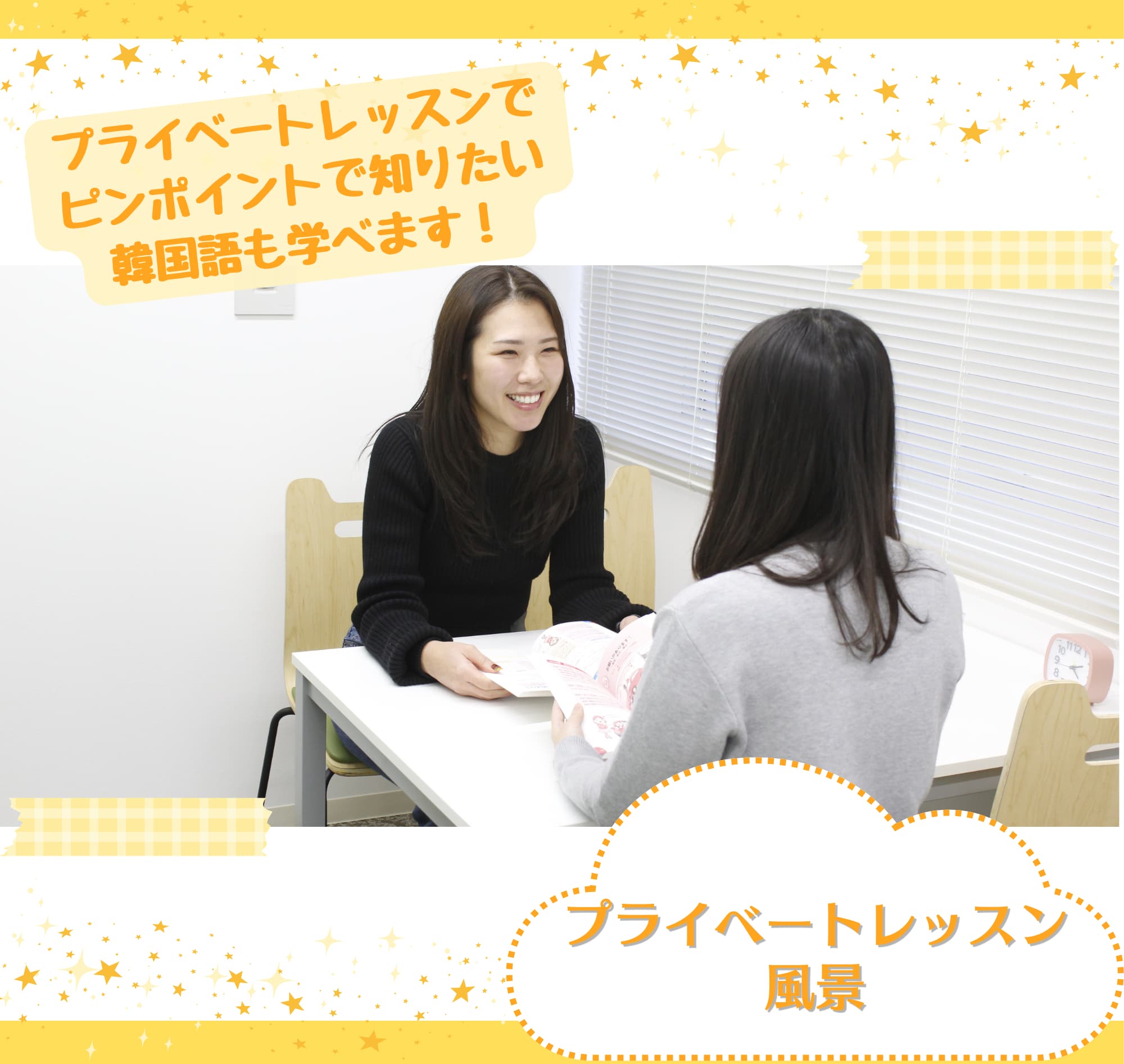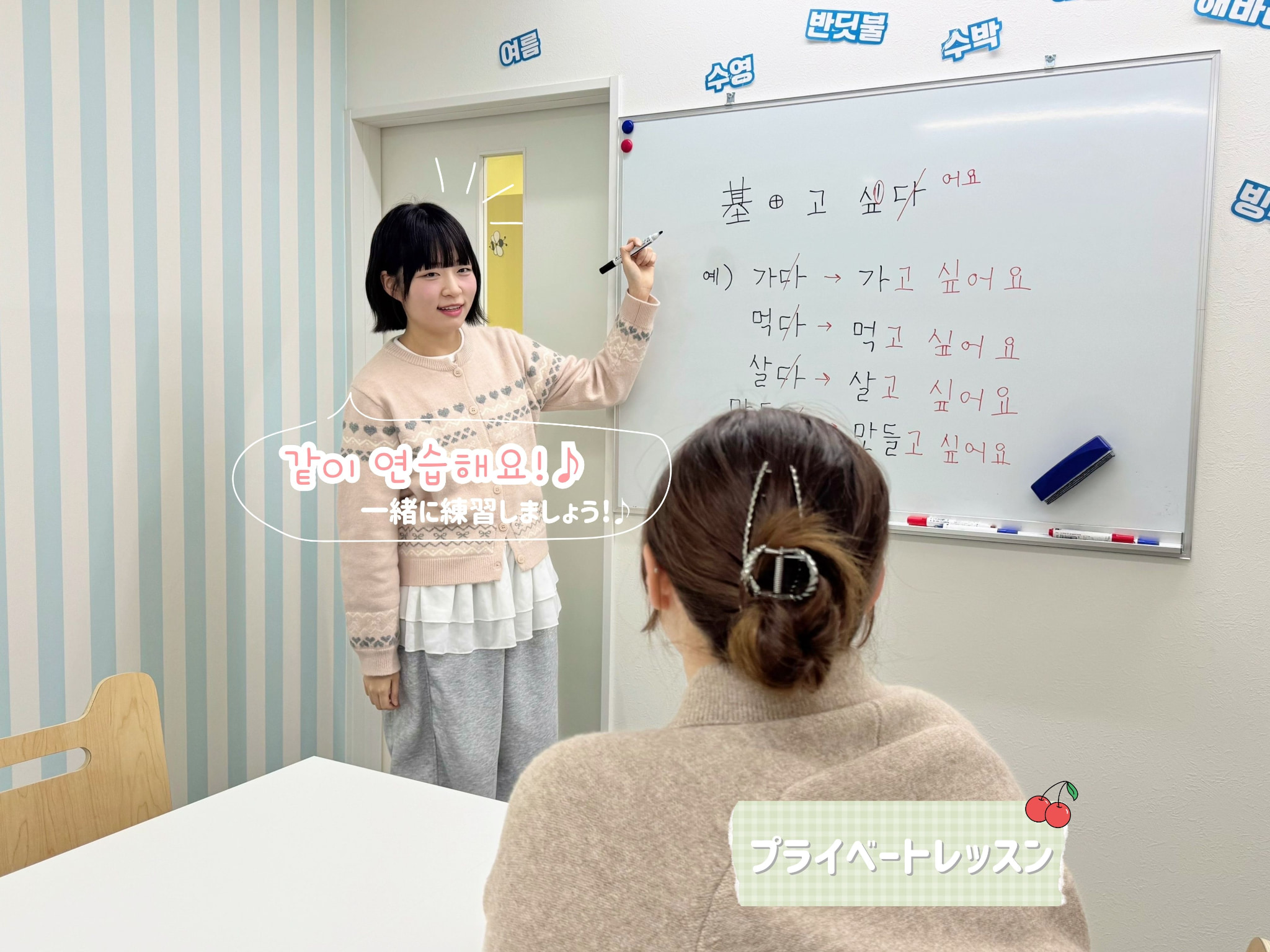 会話ベースの授業が受けたい、ドラマのセリフを覚えたい、KPOPの歌詞が知りたい、TOPIK(韓国語能力試験)の対策がしたい、韓国語でフリートークをしたいなど、授業内容は何でもOKなのもプライベートレッスンならでは!