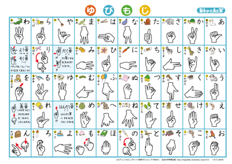 日本の指文字は、1つの動作で1つの文字を表せるのが殆どですが、表の赤く矢印が付いているものや濁音などは動きをつけて文字を表します✋