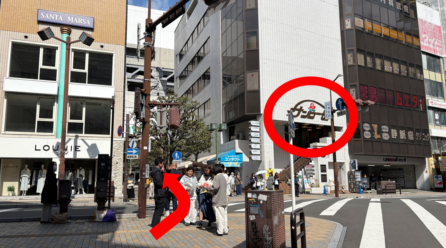 セノバに向かって歩きます。横断歩道まで行き、右手側にピンクの柱が見えます。