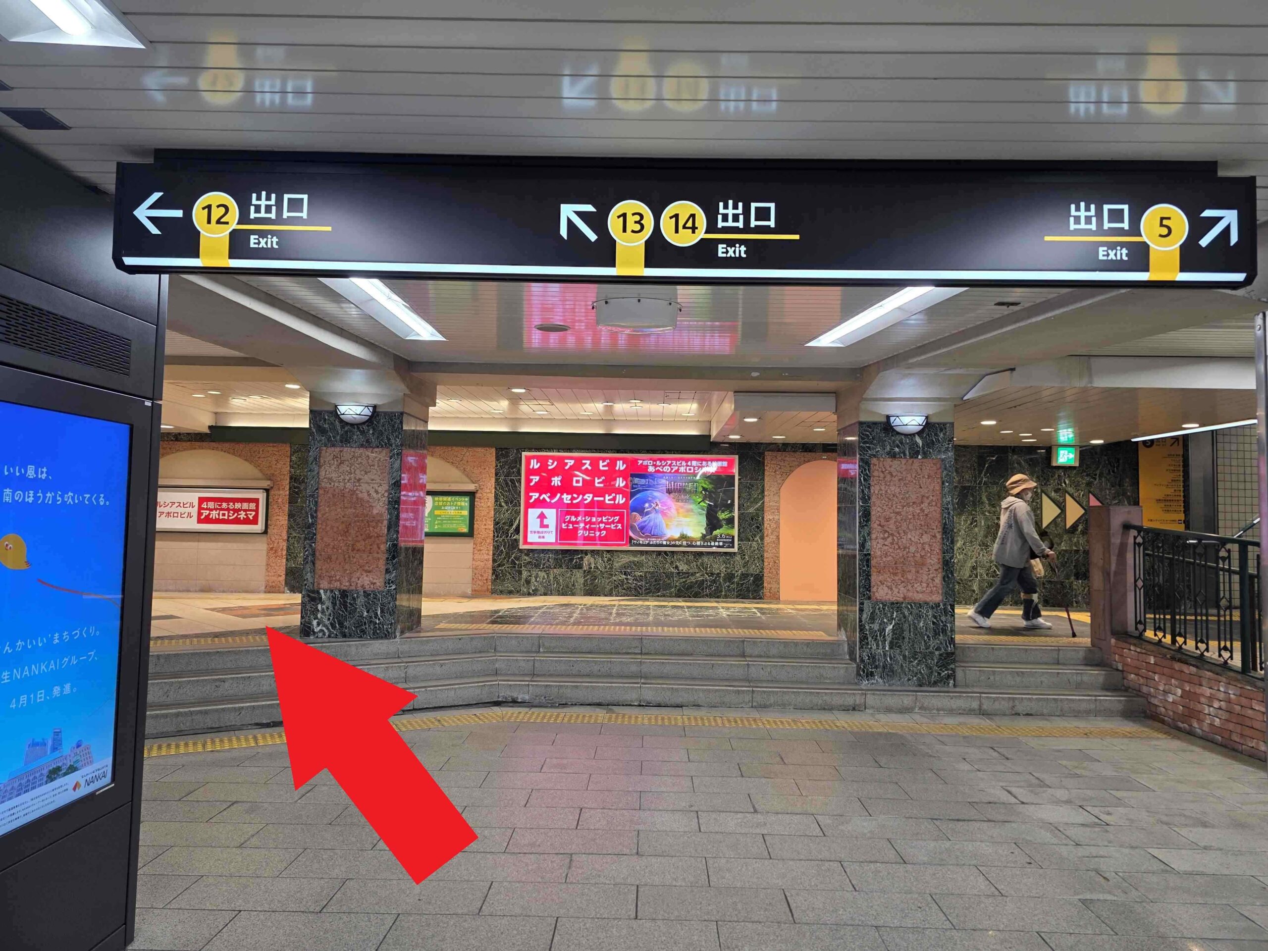 14番出口の階段を下り直進し2つ目のビルが「あべのアポロビル」です。