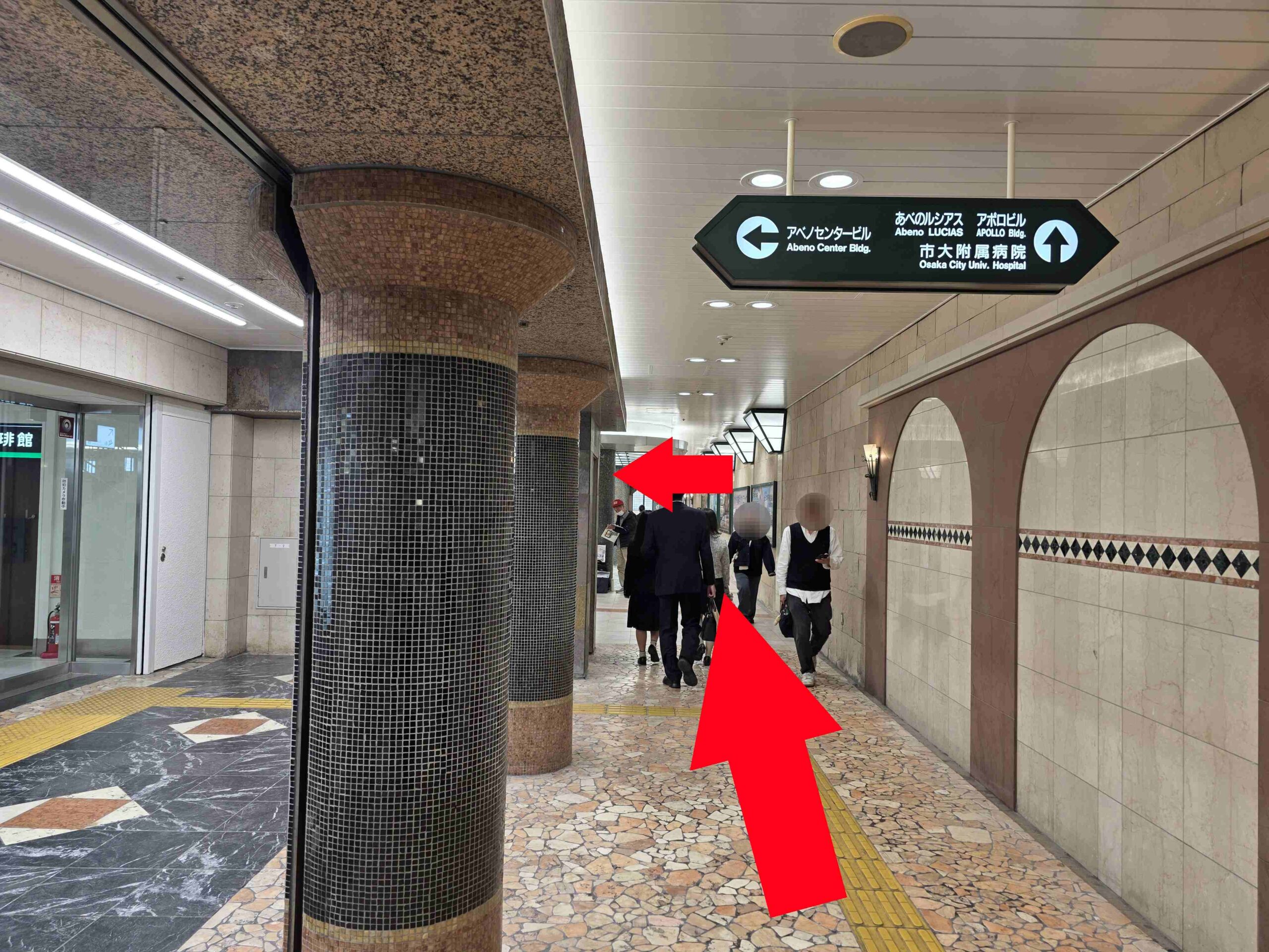 JR天王寺駅 中央口改札を出て南口方向に進みます。Osaka Metro天王寺駅7番出入口の階段を下りて右折し14番出口を目指します。