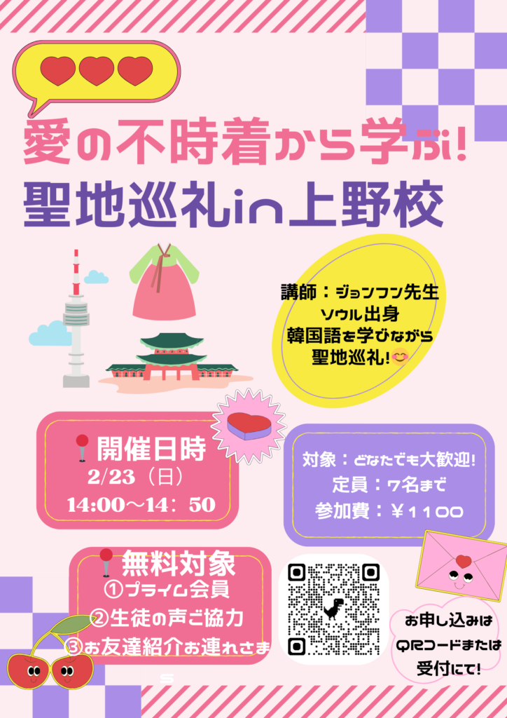 2月は、【愛の不時着から学ぶ!聖地巡礼in上野校】です!😊