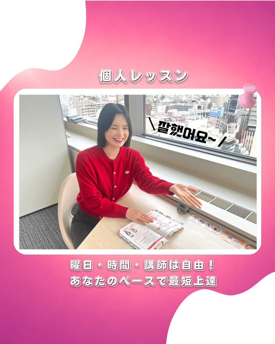 会話ベースの授業が受けたい、ドラマのセリフを覚えたい、KPOPの歌詞が知りたい、TOPIK(韓国語能力試験)の対策がしたい、韓国語でフリートークをしたいなど、授業内容は何でもOKなのもプライベートレッスンならでは!