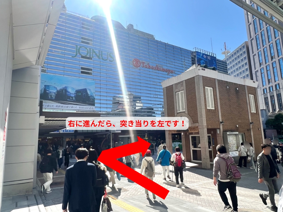正面にタクシー乗り場が見えますので、左方面へ進みます。(交番を通り過ぎ、横浜高島屋方面です。)