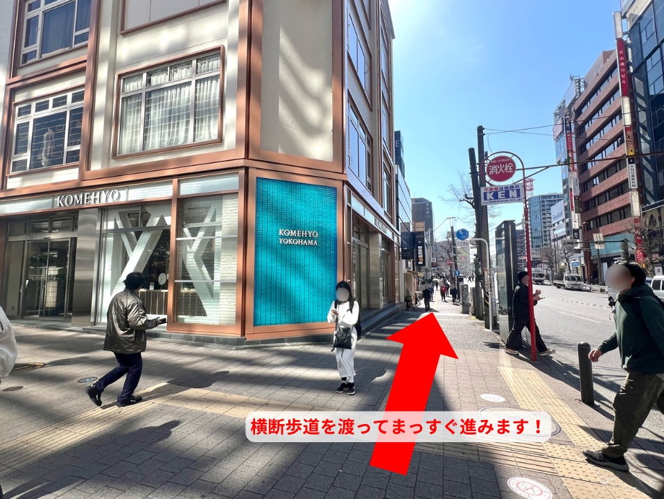 横浜高島屋正面入り口が見えたら、入り口を左手にして直進し、突き当りを左に曲がってください。そのまま道なりに直進していただき、ドトール(横浜南幸店)が見えたらその先の横断歩道を渡ってください。