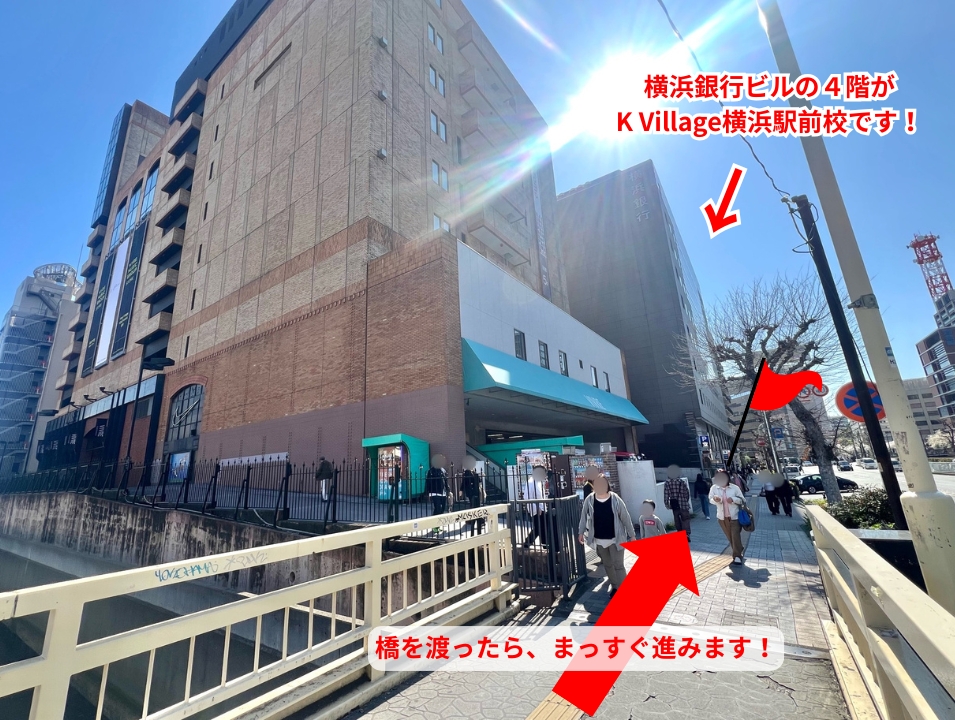 横断歩道を渡るとVIVREの建物後方に「横浜銀行」のビルが見えてきます。校舎はそちらのビル4階となり、KVillage横浜駅前校へお越しいただけます!