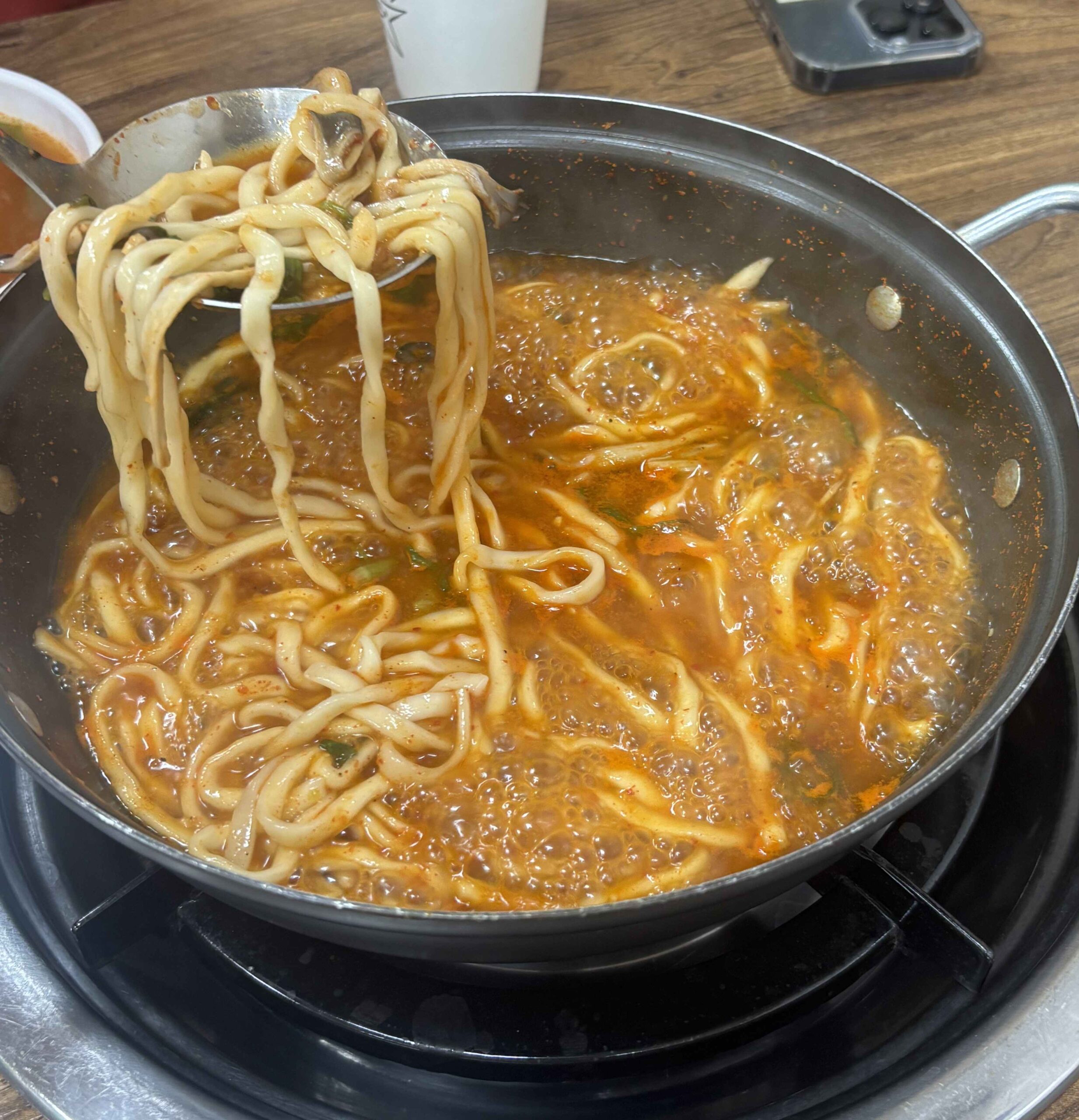 お肉をある程度楽しんだら、次はカルグクス(韓国式手打ち麺)を投入。