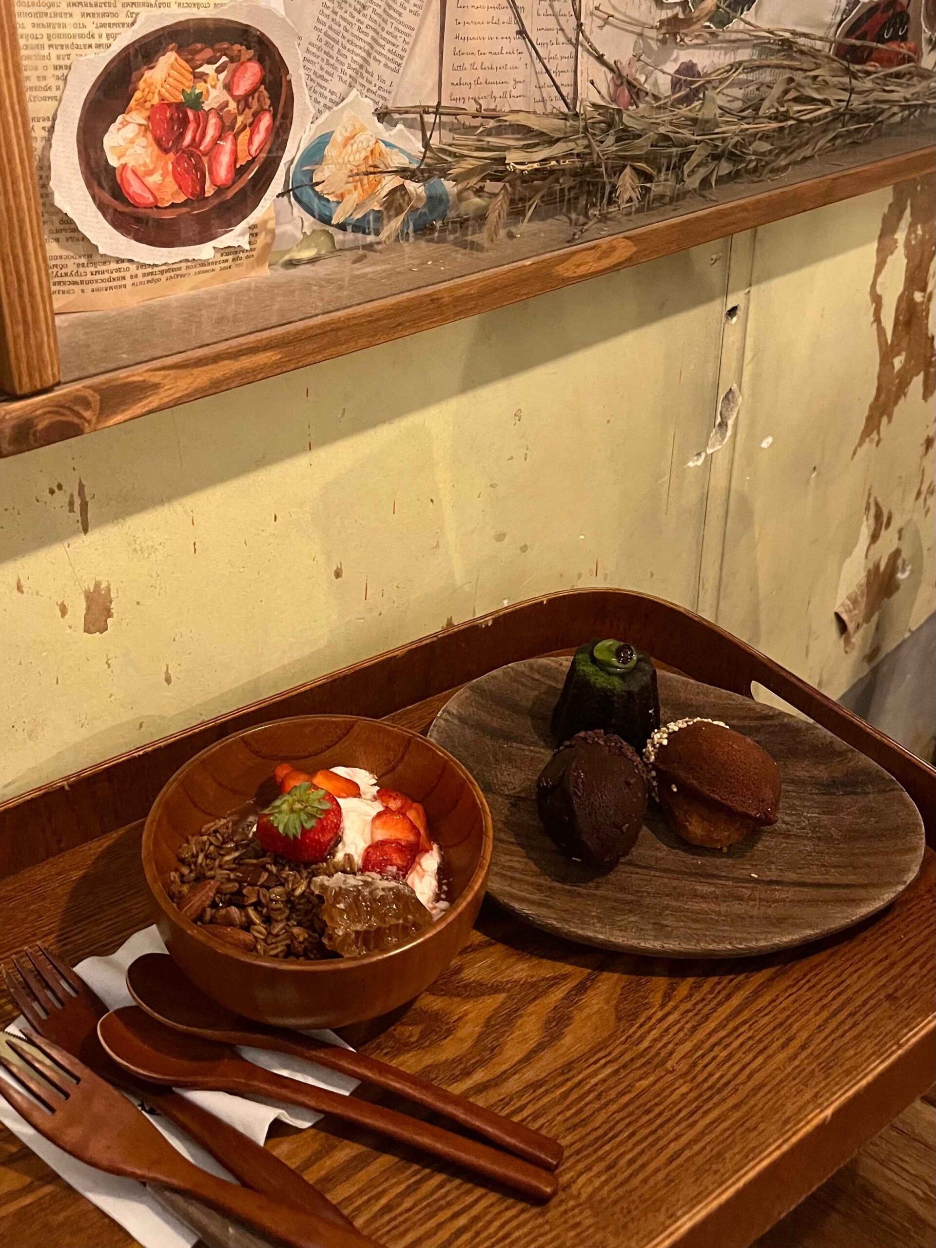 私は、ヨーグルトとどんぐりマドレーヌを友達と分け合って食べました🍴