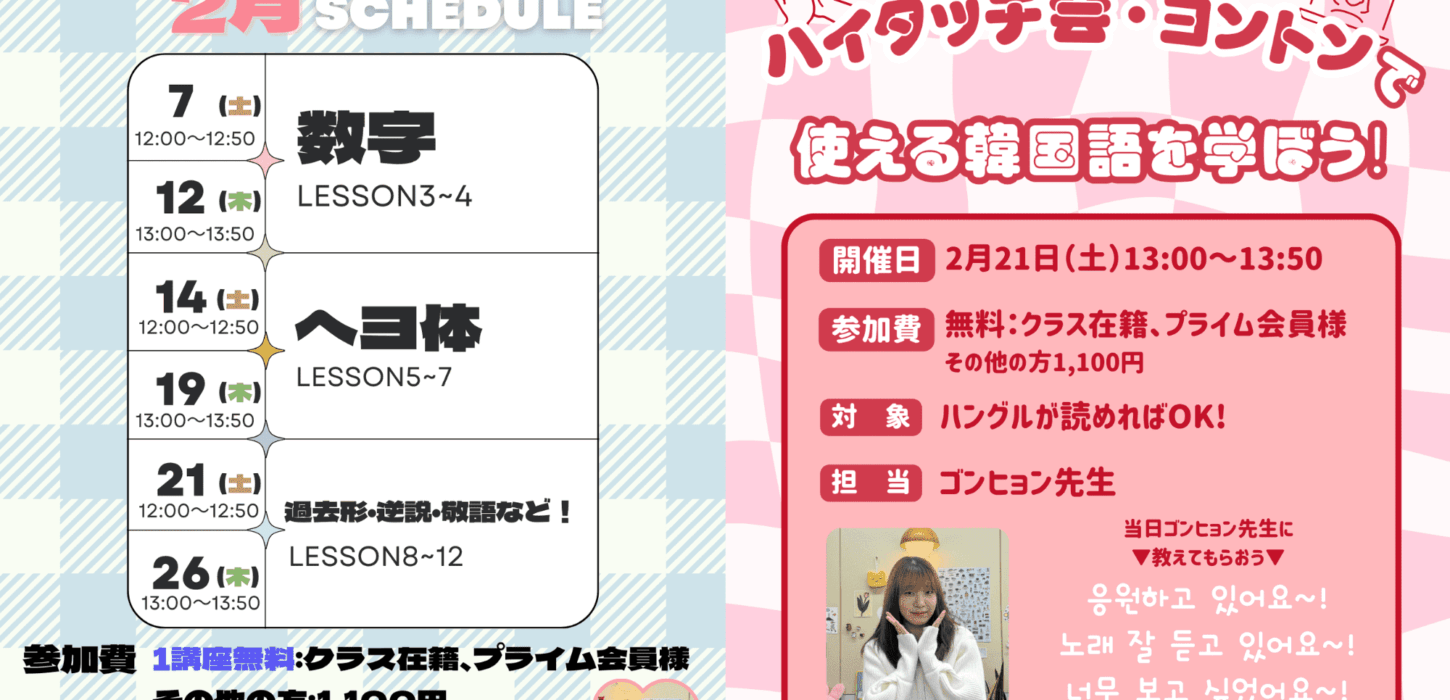 この記事の目次【復習/推し活】2月イベントのお知らせ💞📝すぐ①復習講座💖ハイタッチ会・ヨントンで使える韓国語を学ぼう!韓国のトレンドをいち早くキャッチしたい人は、K Vil … 続きを読む 【復習/推し活】2月イベントのお知らせ♡